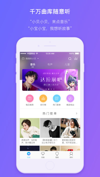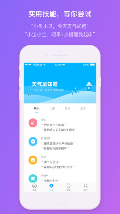 3、众多的技能玩法如语音点播音乐、查询天气、设定闹钟等;